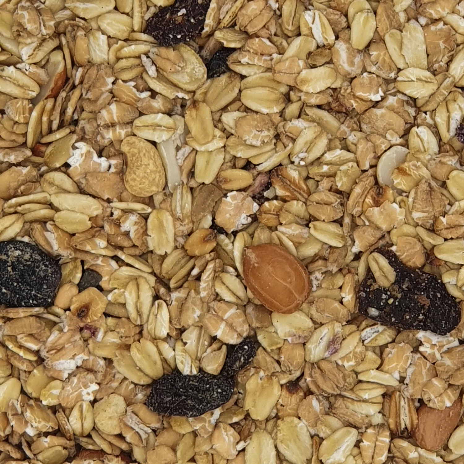 Es wird ausschließlich gemischt mit Flocken* aus Qualitätsgetreide (Lebensmittelqualität). Es wird hergestellt aus gereinigtem, entspelztem, hydrothermisch behandeltem Qualitätsgetreide (gedämpft bei 90°). Des Weiteren achten wir auf einen ausgewogenen Anteil an Erdnüssen und Sultaninen. Die Qualität wird darüber hinaus bestimmt durch einen hohen Anteil Tafelöl in Lebensmittelqualität.